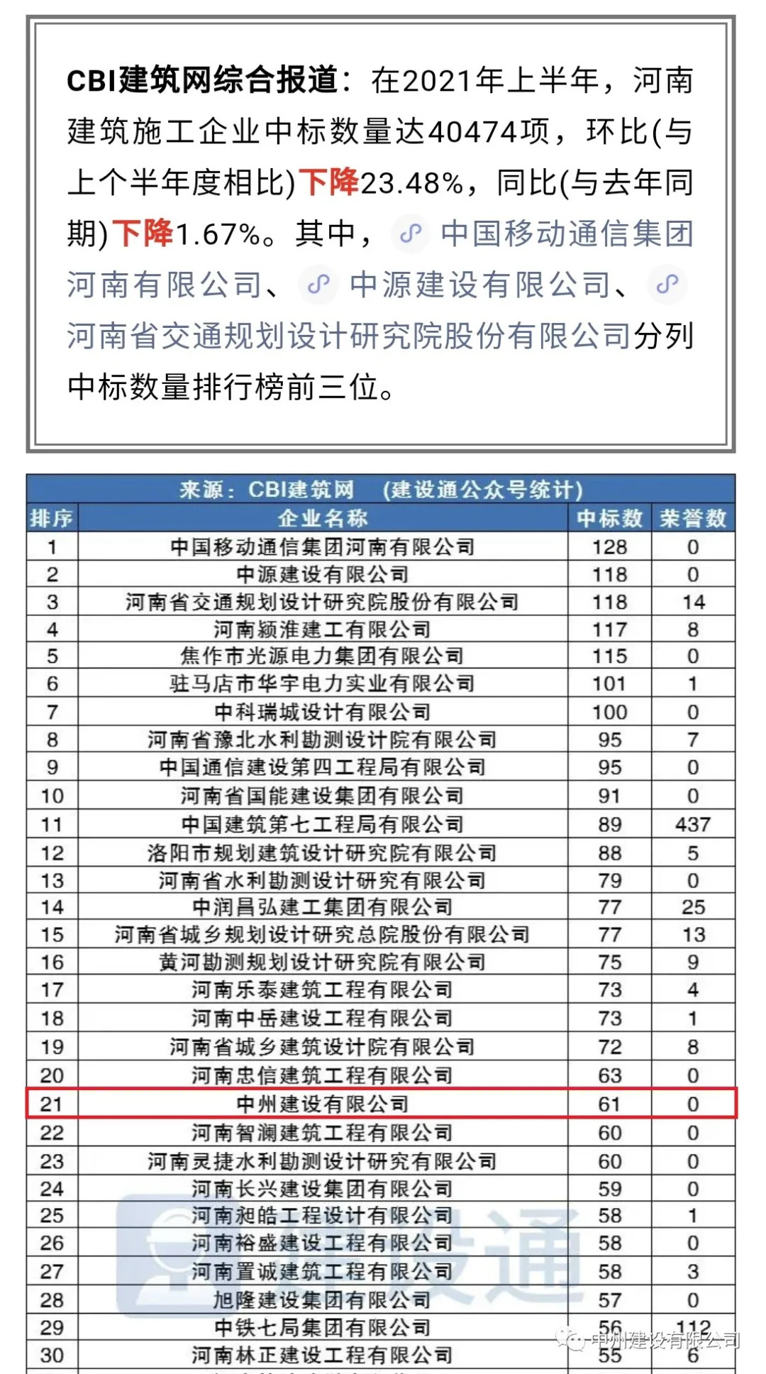 中州建設(shè)有限公司憑借專業(yè)的施工裝備、良好的社會信譽(yù)、優(yōu)秀的施工隊(duì)伍、科學(xué)合理的報(bào)價(jià),在投標(biāo)活動中強(qiáng)力出擊,連連中標(biāo)。 據(jù)CBI建筑網(wǎng)綜合報(bào)道,在2021年上半年,河南建筑施工企業(yè)中標(biāo)數(shù)量達(dá)40474項(xiàng),中州建設(shè)有限公司成功躋身前100強(qiáng),位列第21位。