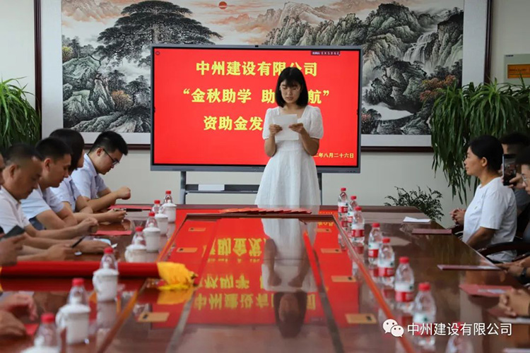 金秋助學(xué)紓民困,齊心共圓大學(xué)夢。8月26日上午,中州建設(shè)有限公司“金秋助學(xué),助夢遠(yuǎn)航”資助金發(fā)放儀式在公司辦公大樓會議室隆重舉行。受公司姚義民董事長委托,中州建設(shè)有限公司副總經(jīng)理林鶴、李洪中等領(lǐng)導(dǎo)出席了大會,長垣十中黨總支副書記杜海軍、工會副主席張軍建和受公司資助的10位優(yōu)秀大學(xué)生及家長出席了資助大會。